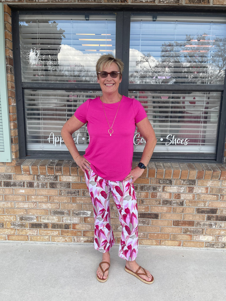 Meet the Blossom Breeze Tee: a hot pink crewneck that’s softer than a cloud on a cotton candy day! With its high-low hem, you’ll feel like you’ve just stepped off a fashion runway (or at least your living room). Perfect for turning heads and bringing the sass!