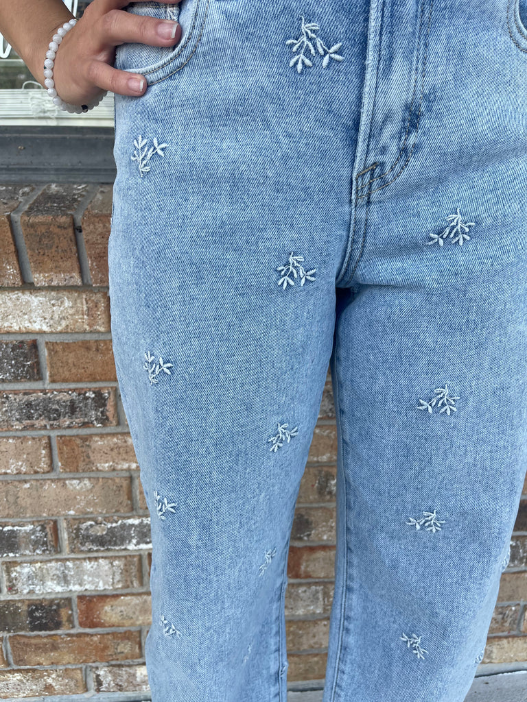 Add a touch of cuteness to your wardrobe with our Bluebird Barrel Jeans. Made with 2% spandex, these trendy jeans offer a comfortable fit for any season. The cuffed light denim wash is adorned with a cute embroidered leaf design, perfect for the upcoming fall, spring, and summer months.