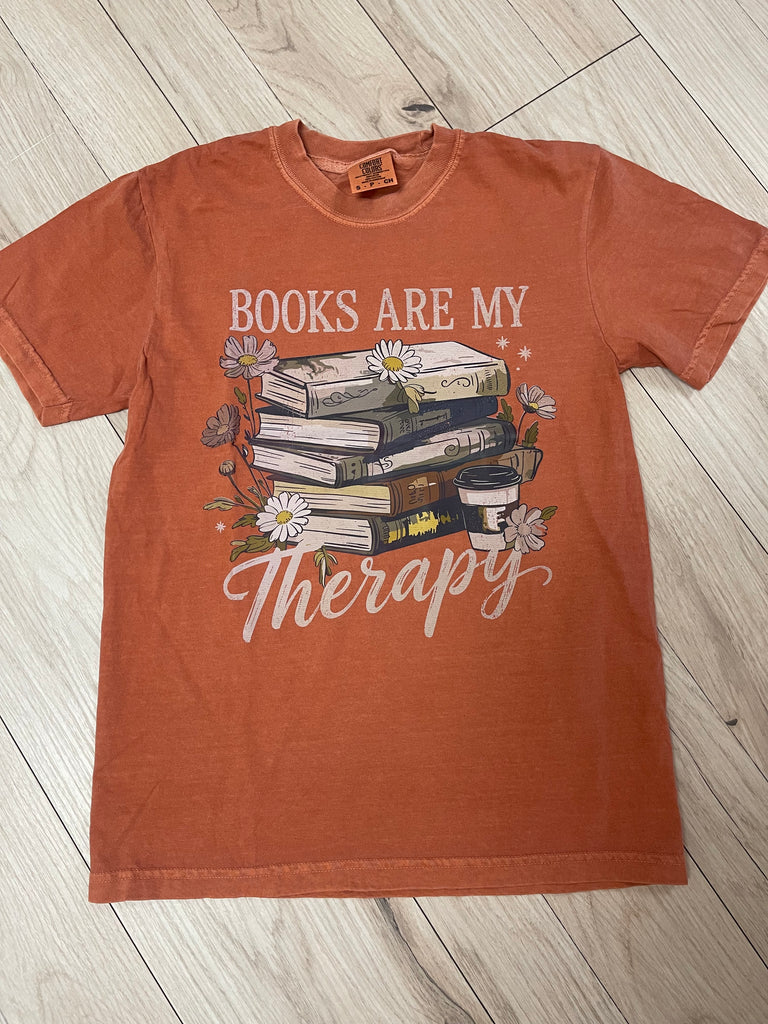 Indulge in the therapeutic benefits of reading with our "Books are Therapy" t-shirt. Show off your love for books while promoting self-care and relaxation. With a comfortable fit and stylish design, this shirt is perfect for any bookworm looking to make a statement.