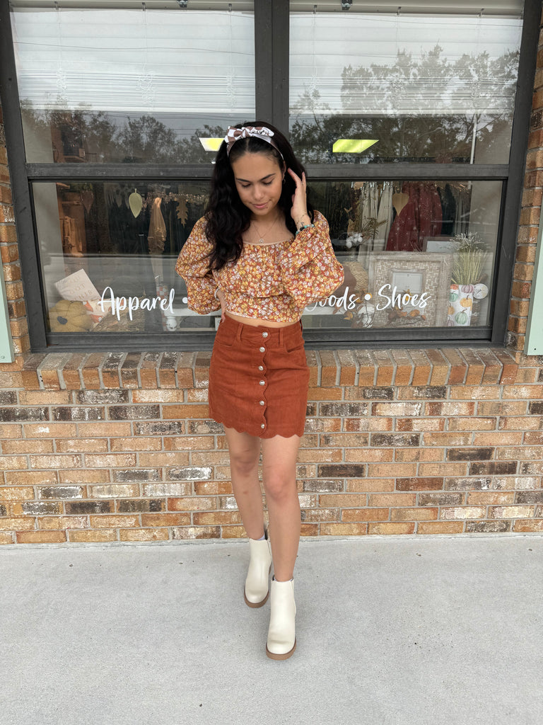 Expertly crafted, this Brick Corduroy Mini Skirt features a scallop buttoned front and convenient pockets for a functional yet stylish addition to your wardrobe. Made with soft corduroy fabric, this skirt is both comfortable and trendy. Perfect for any occasion, dress it up or down with ease.