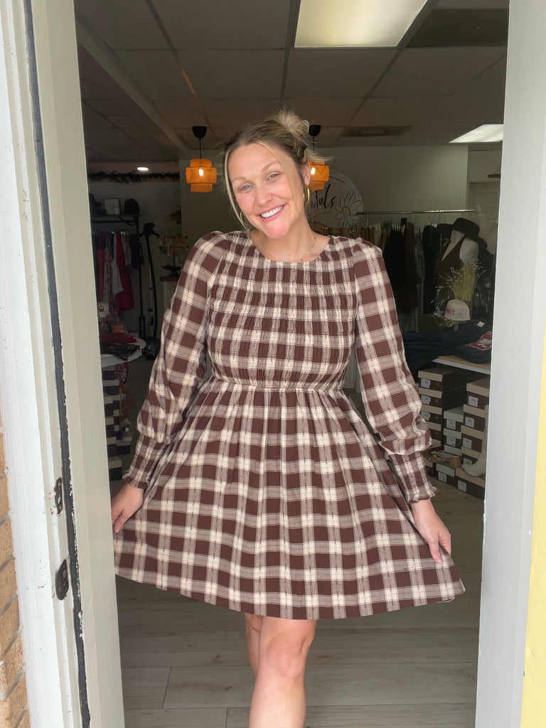 Sweet, sassy, and oh-so cozy β the Brown Sugar Babe Dress is your new go-to for plaid perfection. Featuring a mocha plaid print with a smocked bodice for the perfect fit, this mini is flirty yet comfy in all the right ways. The flowy skirt gives it that twirl-worthy charm, while the long sleeves keep it chic for cooler days. Pair her with boots and a crossbody for pumpkin patch vibes, or dress her up with heels for a night out. Either way, sheβs serving sweet as sugar, bold as you. β¨