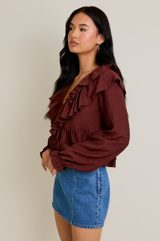 Upgrade your fall wardrobe with our Café Con Leche Ruffle blouse. Crafted from a blend of 82% rayon and 18% nylon, this V-neck blouse features a delicate ruffle detail that adds a touch of elegance. Perfect for the upcoming holidays, the beautiful line brown color will make you stand out. True to size, but we do recommend sizing up for the perfect fit.