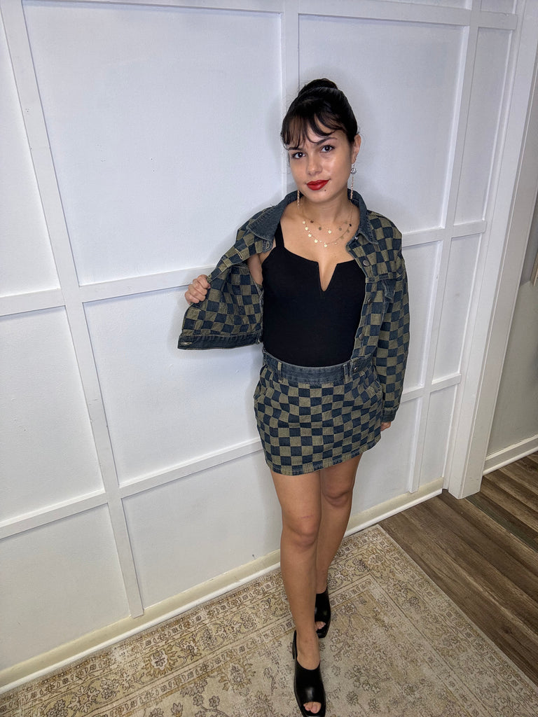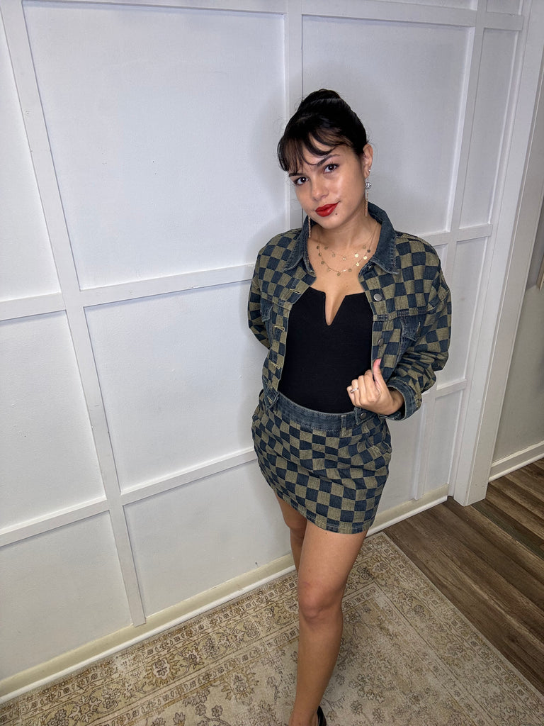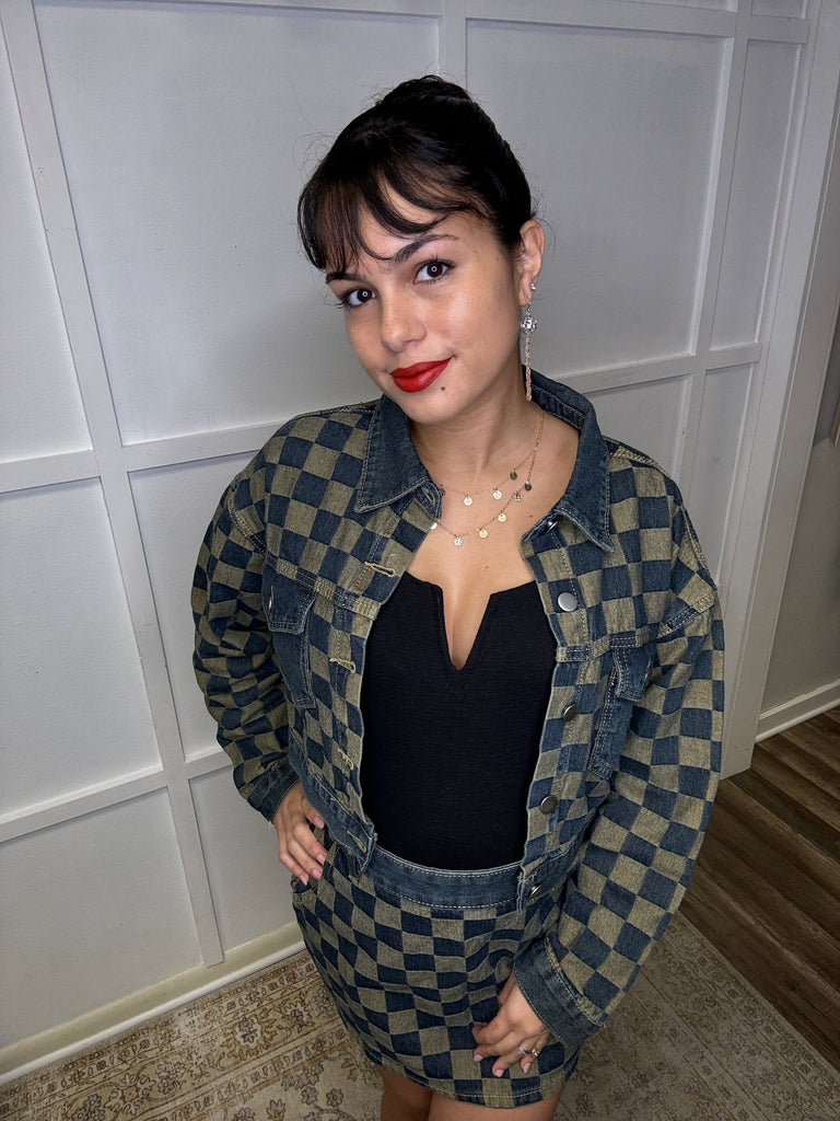 Experience the perfect blend of style and comfort with our Checkered Crop Denim Jacket. Crafted with a timeless denim shacket design, this jacket flaunts a chic checkered pattern. Button up and cropped, with convenient pockets, for a versatile and stylish addition to your wardrobe.