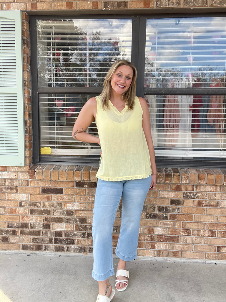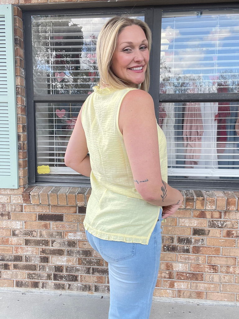 The Golden Sands Tank features a soft, butter-yellow crinkle linen-like fabric, designed to provide both comfort and breathability. Its ruffle design adds a touch of elegance, making it suitable for various occasions. The lightweight material enhances flexibility, allowing for ease of movement throughout the day.