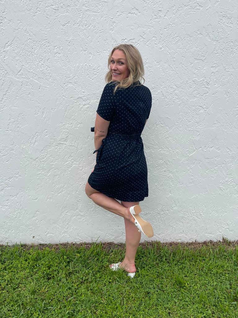 Introducing the Just a Dot Dress, made from 100% cotton material for comfort and breathability. A versatile addition to your wardrobe, it features an elastic smock band in the back, boat neck, and short sleeves. With side ties and a denim white dot pattern, this mini dress is perfect for any occasion.