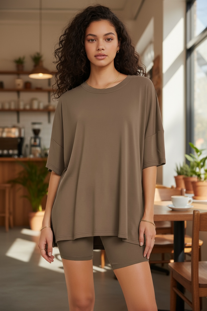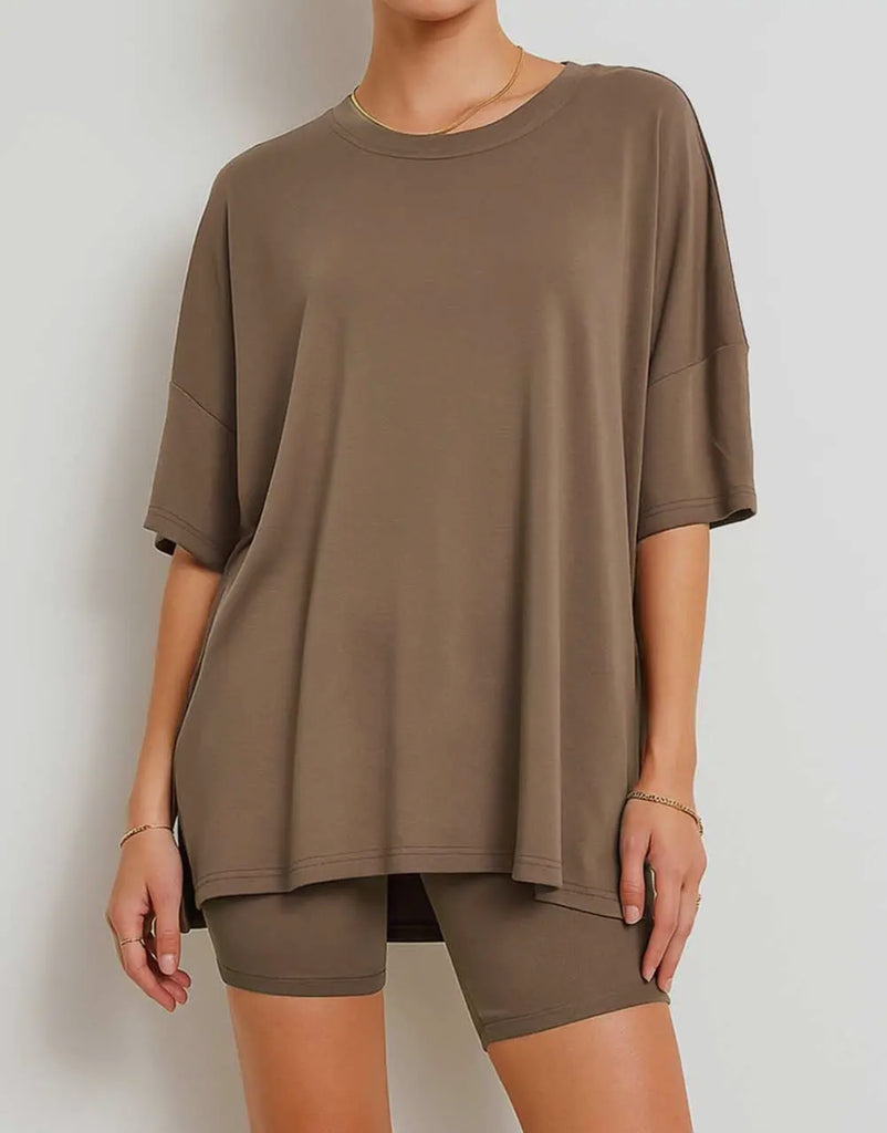 The Morning Mocha Set features a butter soft, oversized top and biker shorts with pockets. Stay comfortable and stylish with this versatile set. Perfect for lounging at home or running errands. You won't want to take it off!