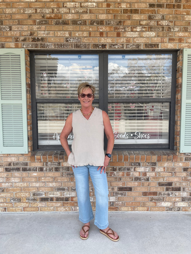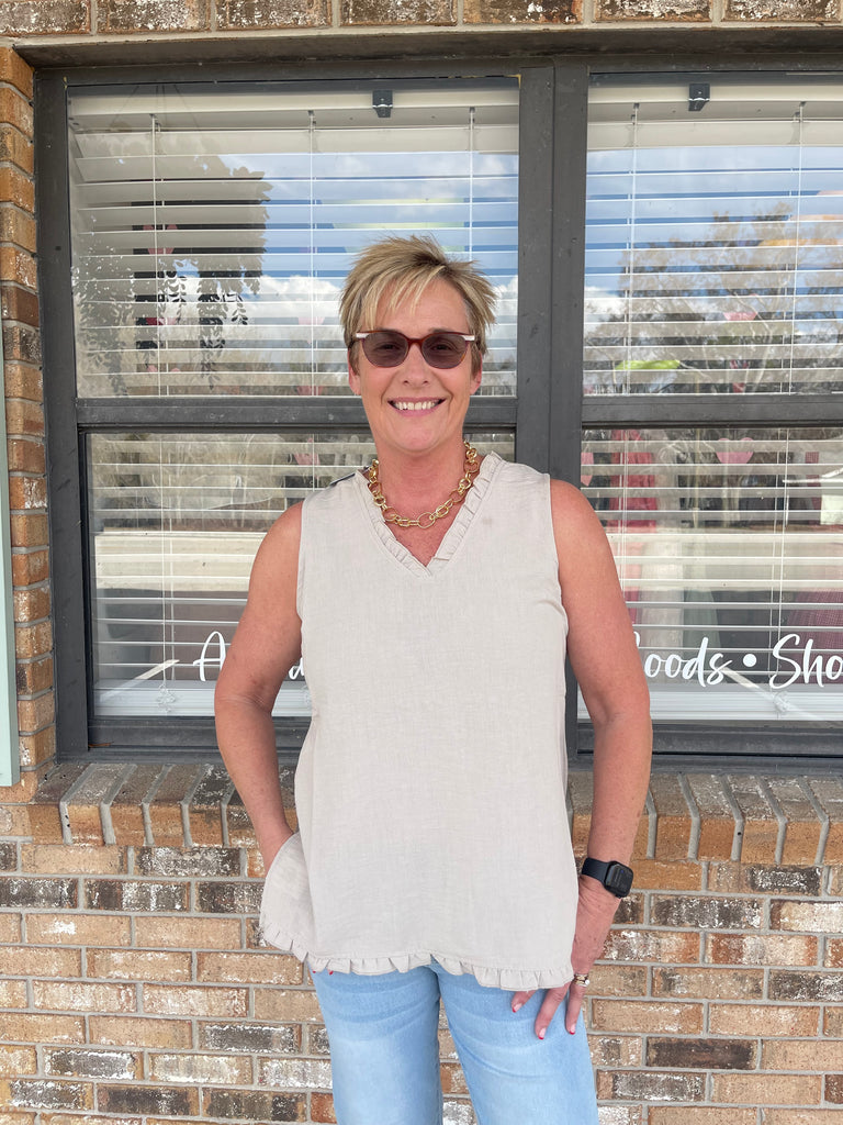 The Pebble Tank features a crinkle linen-like fabric with ruffle detailing, providing a unique texture and visual interest. Its breathable material ensures comfort, while the ruffle design allows for ease of movement. This versatile tank is suitable for various settings, offering an elegant yet casual look.