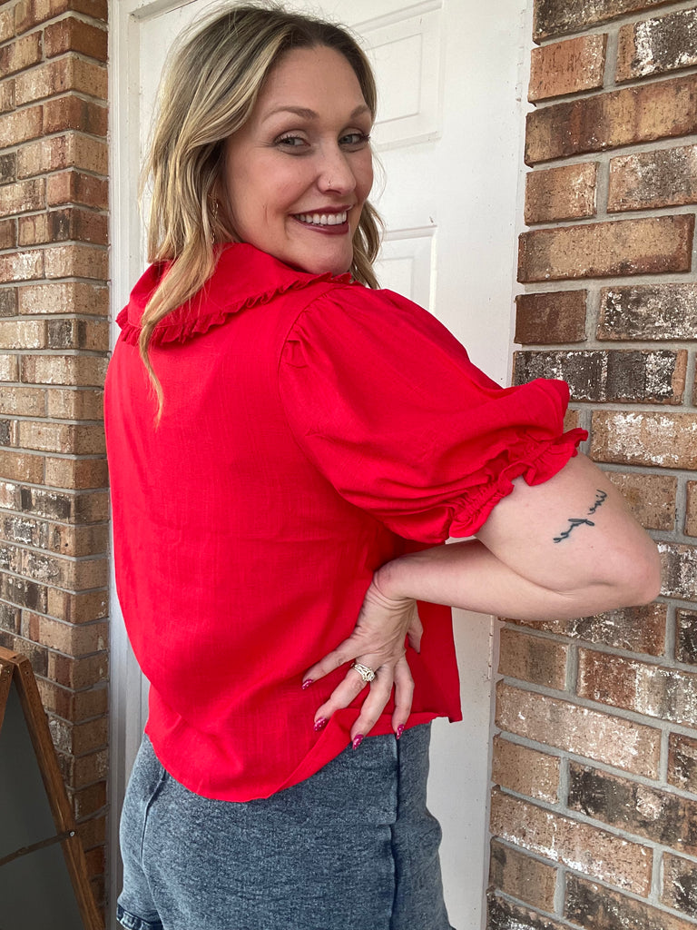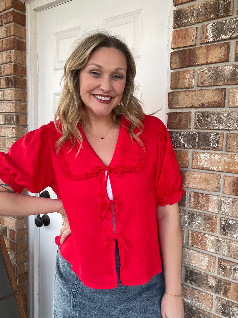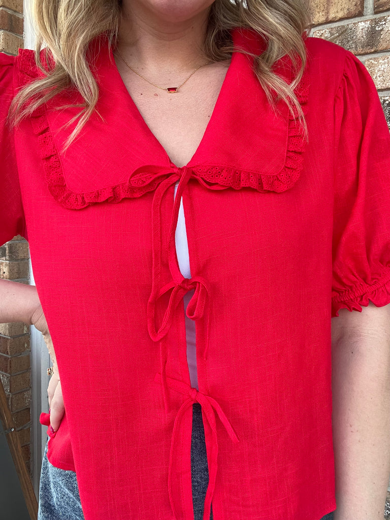 The Ruby Tie Blouse is crafted from high-quality linen, offering breathability and comfort. Its ruby red color enhances visibility, while the tie front adds versatility in styling. The lace trim provides a refined detail, suitable for both casual and formal settings.
