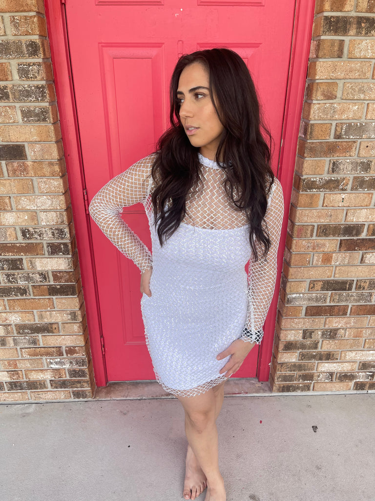 Introducing Sequins Serendipity, the perfect party dress. Its off-white, net long sleeves and mini silhouette are accentuated by a stunning sequin mesh, making you the center of attention. Comes with a slip dress for added comfort and coverage. Elevate your style and shine at any event with this must-have dress.