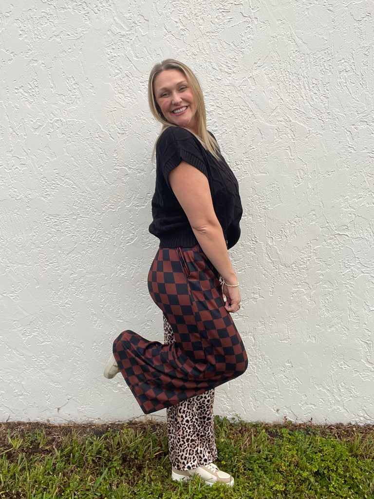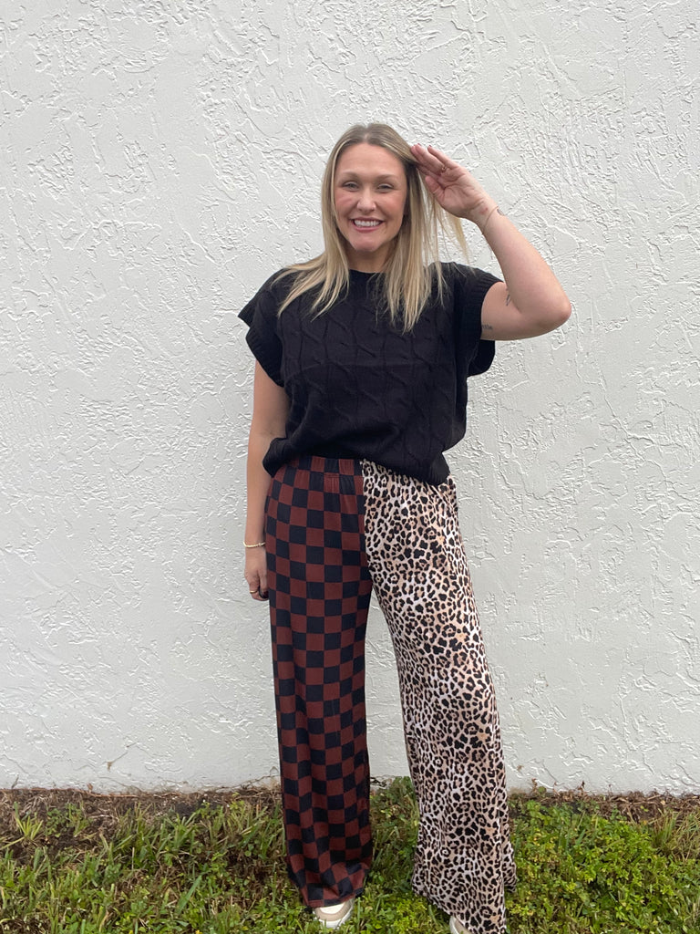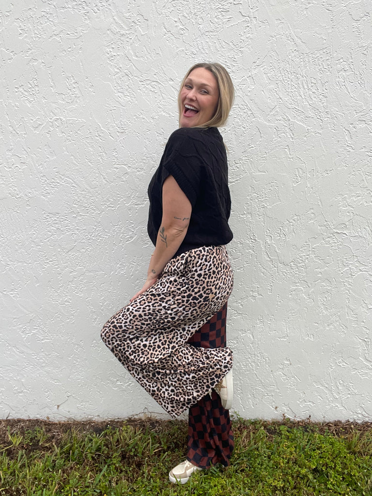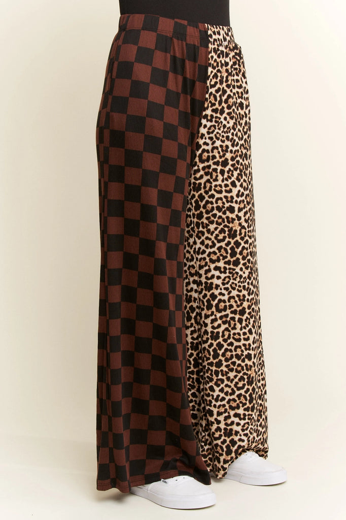 These Split Decision Pants are the perfect combination of style and comfort. Made with a soft and stretchy ribbed material, they feature a unique double print of leopard and checkerboard. The elastic waistband and pockets add functionality, while the slightly flared bottom gives a trendy touch. Plus, with a full length, these pants are perfect for any occasion.