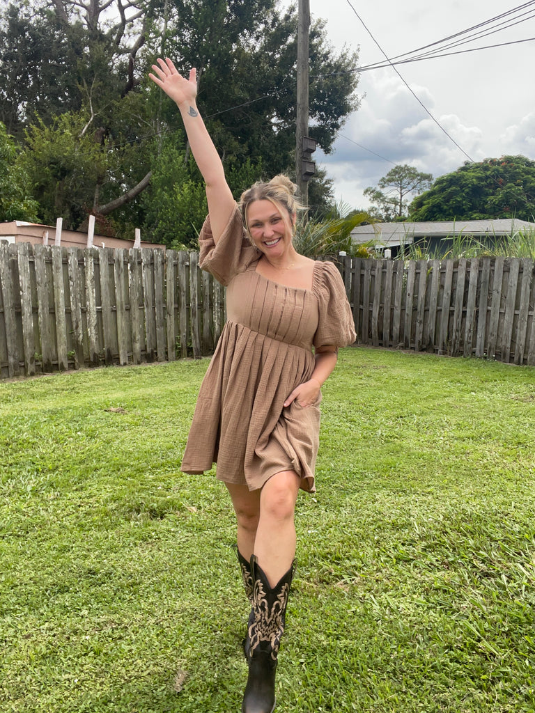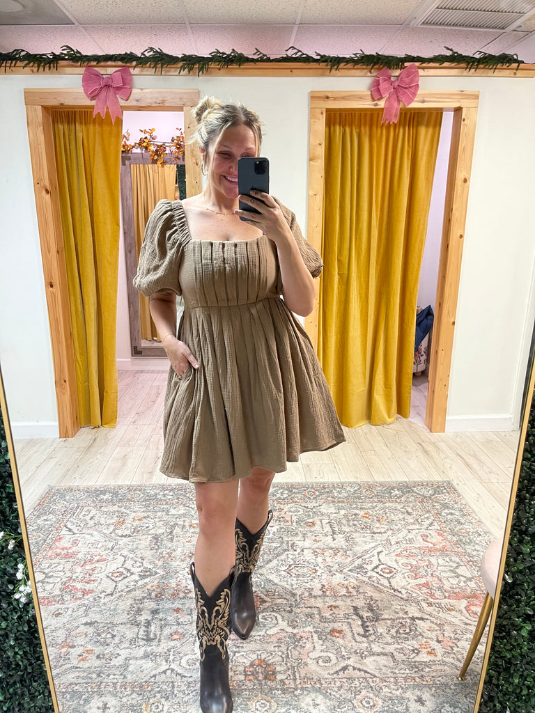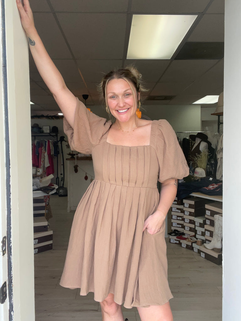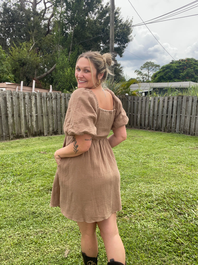 Meet your new fall favorite β this babydoll mini dress was made for pumpkin patch strolls, coffee dates, and every autumn photo-op. Featuring a flattering square neckline, dreamy puff sleeves, and a flowy skirt that twirls just right, sheβs comfy and chic all at once. The lightweight gauze fabric makes it perfect for layering with boots and a cozy cardigan, or dress her up with gold hoops for a night out. Trust us β this is the kind of dress that makes you wish fall lasted forever. β¨
